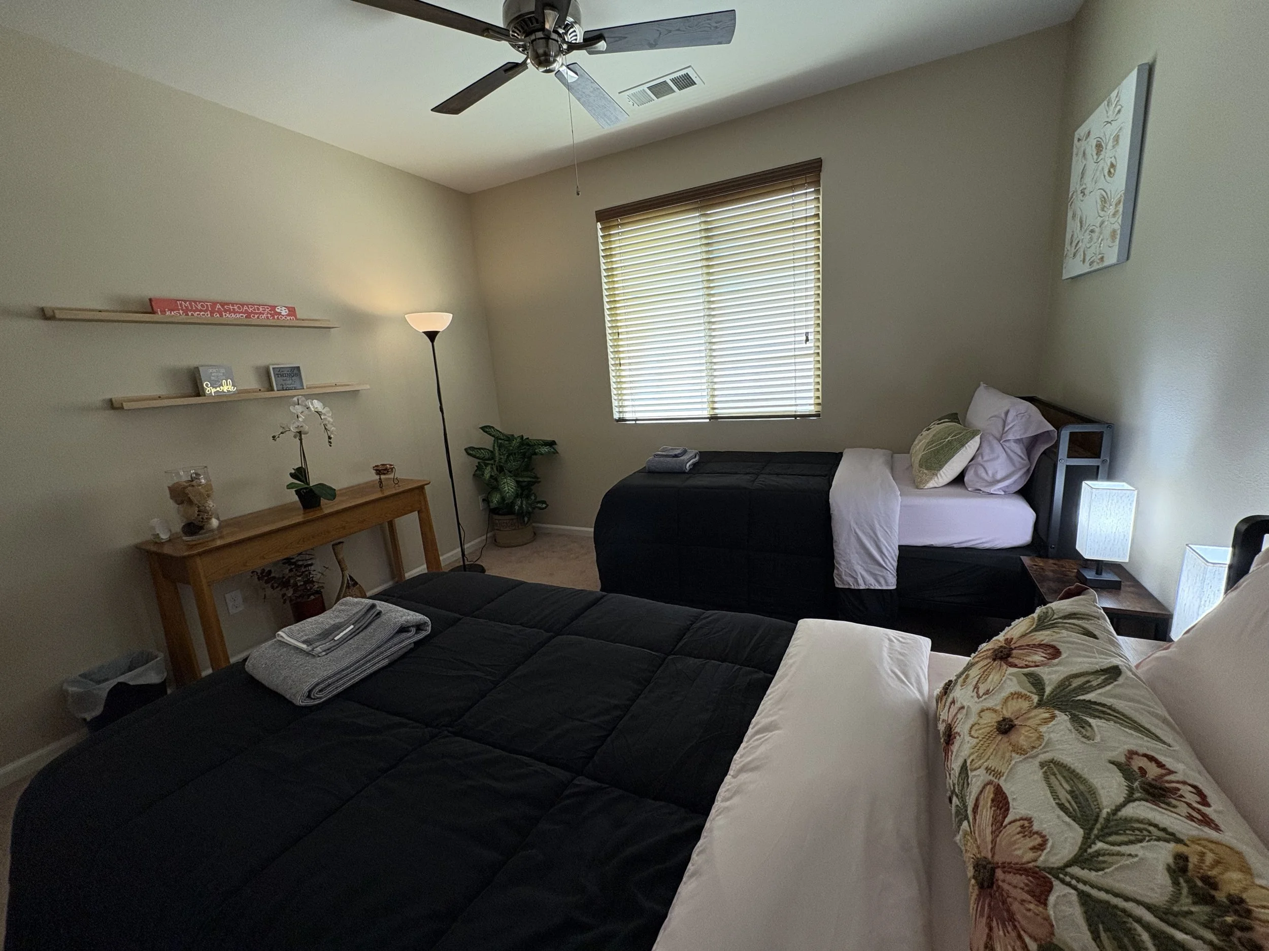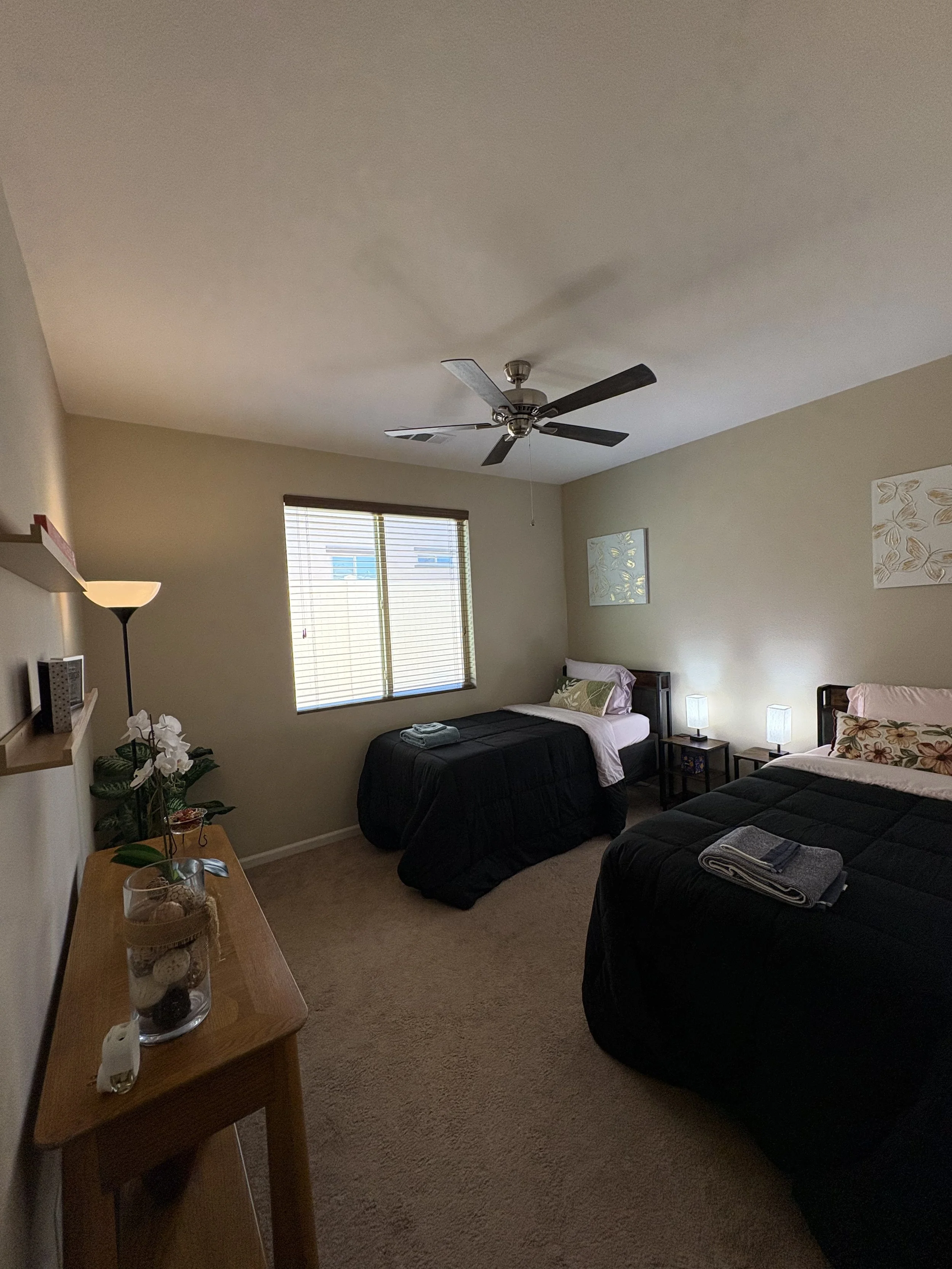 Cozy, calm, and conveniently located, this downstairs bedroom sleeps two comfortably—ideal for early risers or guests who prefer to stay close to the action. With easily accessed bathroom and shared living spaces, it offers both comfort and practicality in one serene corner of the retreat.